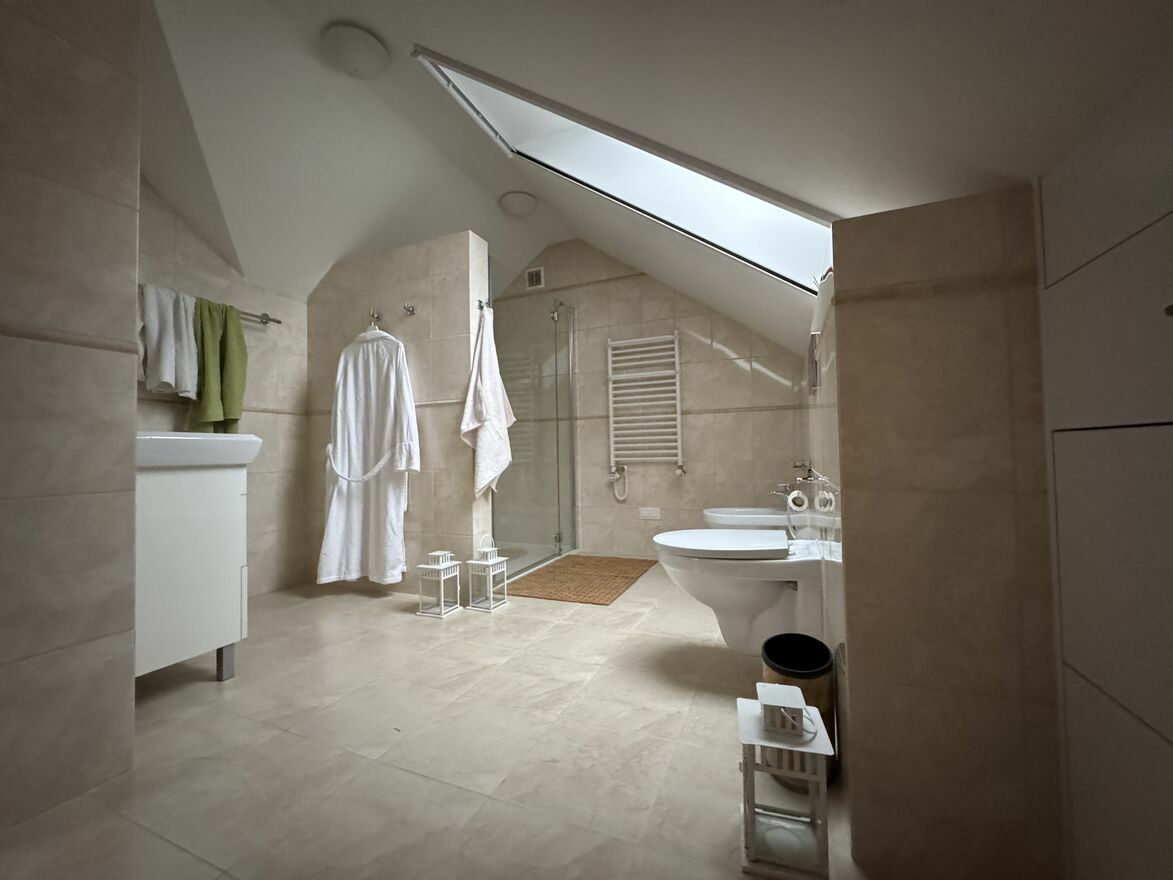 Piętro, to wolna przestrzeń, gdzie obecnie była jedna wielka sypialnia i przestrzeń do pracy, garderoba, zabudowa zintegrowana oraz kolejna duża łazienka.